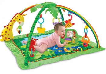 Развивающий музыкальный игровой коврик Fitch Baby Delux Musical Mobile Gym, с которым малышу никогда не будет скучно, предназначен для множества развивающих игр и поможет освоить различные навыки. Так ребёнок, перемещаясь в разные стороны, сможет развить координацию движений, укрепить ножки и ручки, научиться различать очертания и формы при помощи картинок, изображённых на поверхности коврика. Мелкую моторику и хватательные движения поможет натренировать крестообразная дуга с подвешенными к ней игрушками, входящими в комплект. Ко всему прочему, коврик оснащён музыкальным блоком и проигрывает до пяти минут разных мелодий, которые обязательно увлекут вашего кроху. В нашем магазине вы можете приобрести два тематически оформленных коврика на выбор, «Король-лев» со львёнком Симбой или «Жирафик».